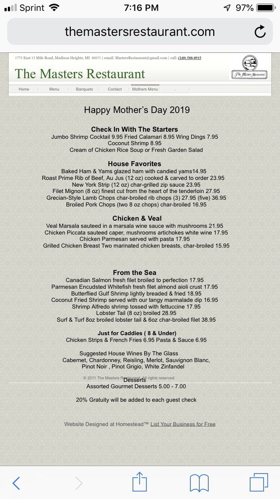 Located in Madison Heights, MI, Masters Restaurant is a classy yet casual American eatery that caters to a variety of clientele. With a golf-themed ambiance and excellent service, this establishment offers dishes that are well-loved by regulars. Customer favorites include fall-off-the-bone ribs, lamb chops, steak, crab legs, and chicken parmesan. The menu also features options for larger groups, making it a great spot for dinner parties and special events. The attentive staff at Masters Restaurant ensures a seamless dining experience, whether you're there for a casual meal or a memorable event. With a full bar, outdoor seating, and free Wi-Fi, this venue provides a comfortable and enjoyable dining atmosphere for all. If you're in the area, make sure to stop by Masters Restaurant for a delicious meal and top-notch service.
